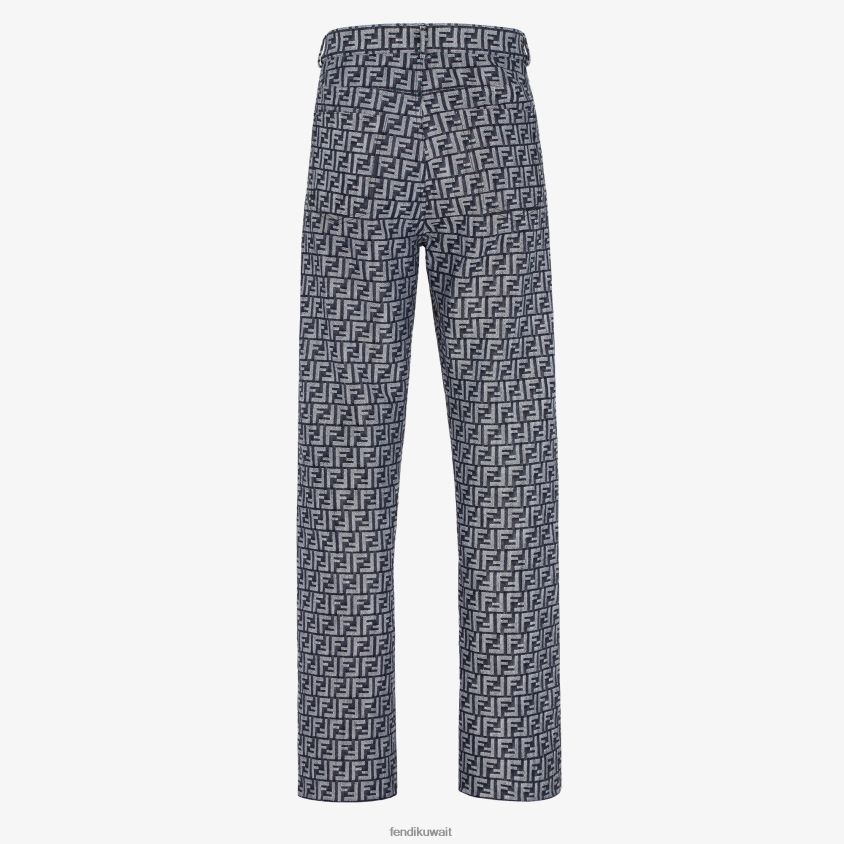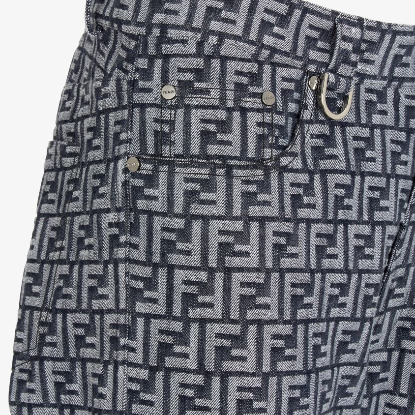بنطال بقصة مستقيمة و5 جيوب. إغلاق بسحاب وزر. مصنوع من قماش الدنيم الأزرق مع زخارف جاكار ff على كامل التصميم. مزين بمسامير الشعار وحلقة معدنية على حلقات الحزام عند محيط الخصر.