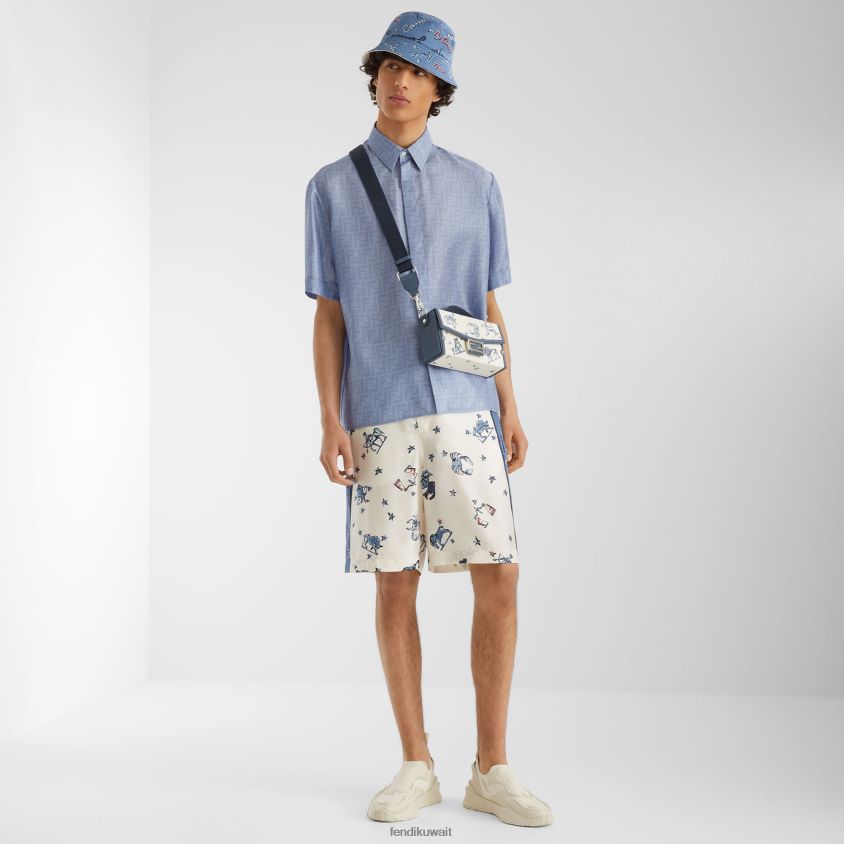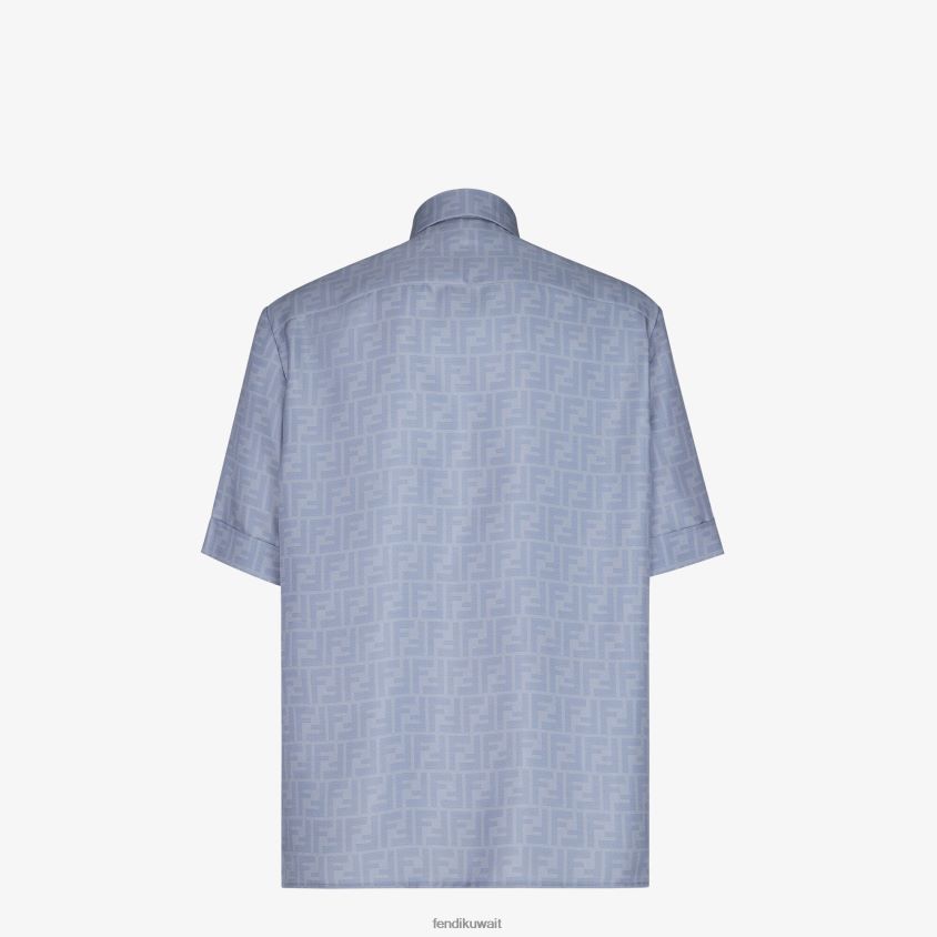 قميص كبير الحجم بياقة على الطراز الإيطالي وأكمام قصيرة. إغلاق بزر مخفي. مصنوع من الحرير باللون الأزرق الفاتح مع زخرفة جاكار ff بنفس اللون على كامل التصميم. زر علوي مرئي.