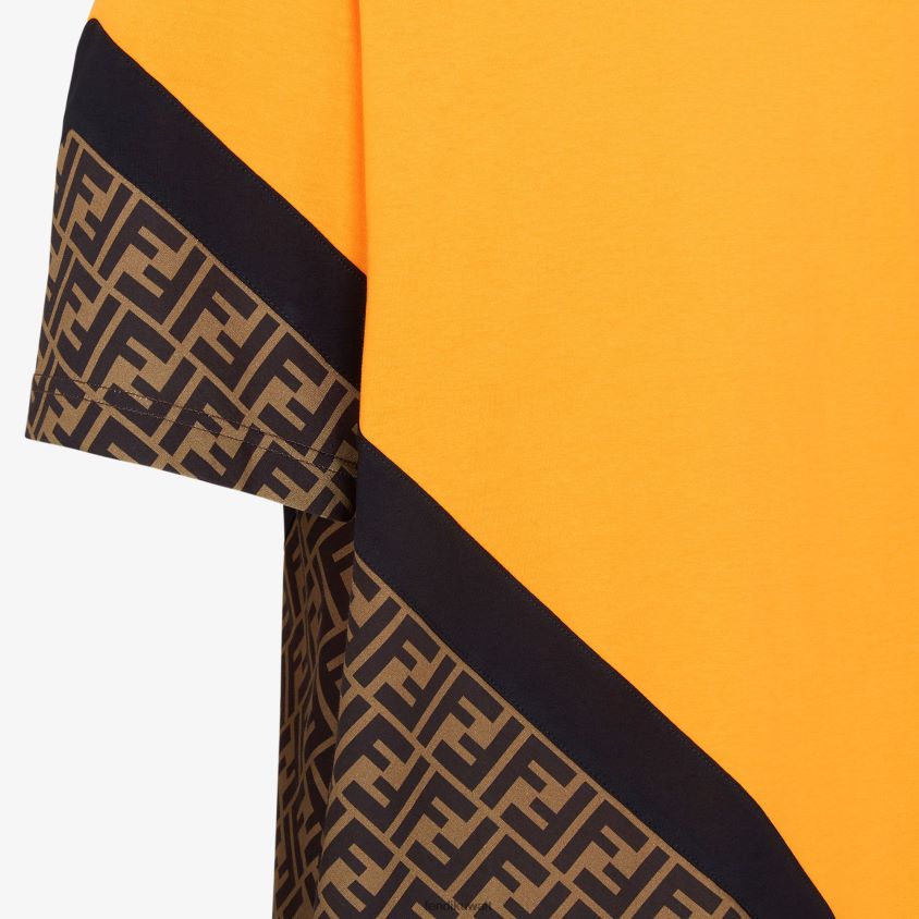 تي شيرت برقبة دائرية وأكمام قصيرة. مصنوع من جيرسي برتقالي. مزين بإدخال ff قطري باللون البني وشريط أسود متباين.