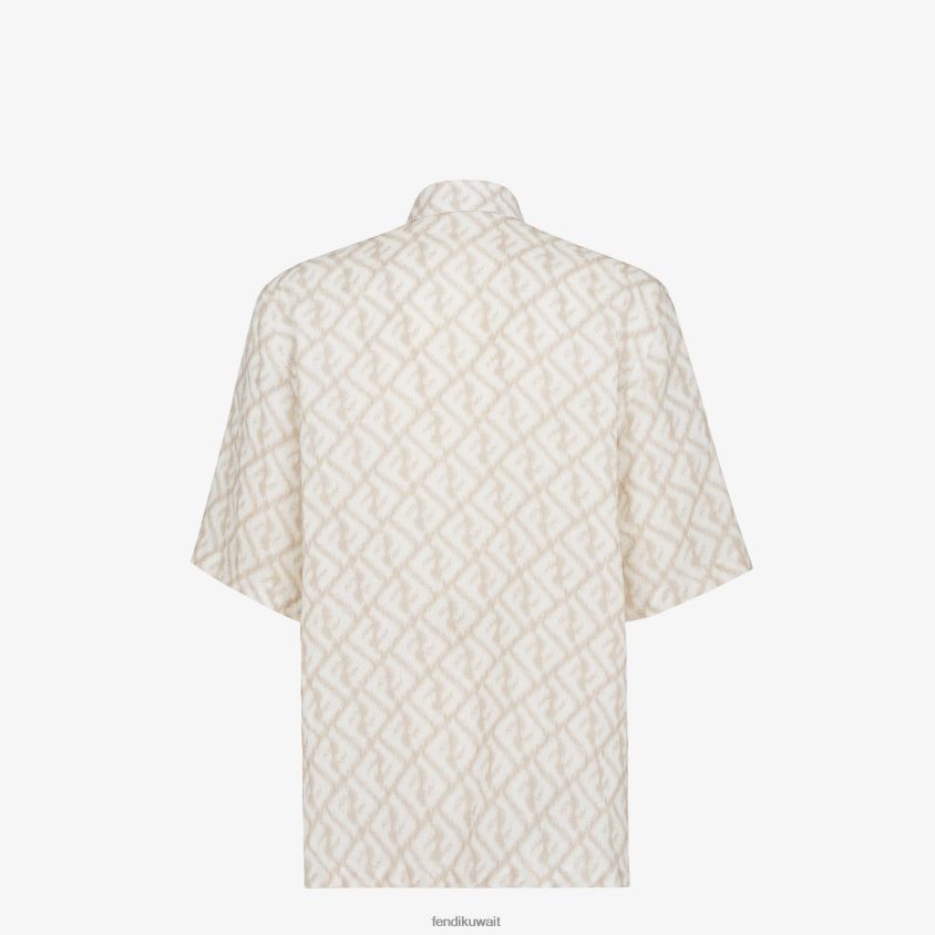 قميص كبير الحجم بياقة على الطراز الإيطالي وأكمام قصيرة. إغلاق بزر مخفي. مصنوع من الكتان مع شعار ff مائل بتأثير ikat ومطبوع بالكامل باللون البيج.