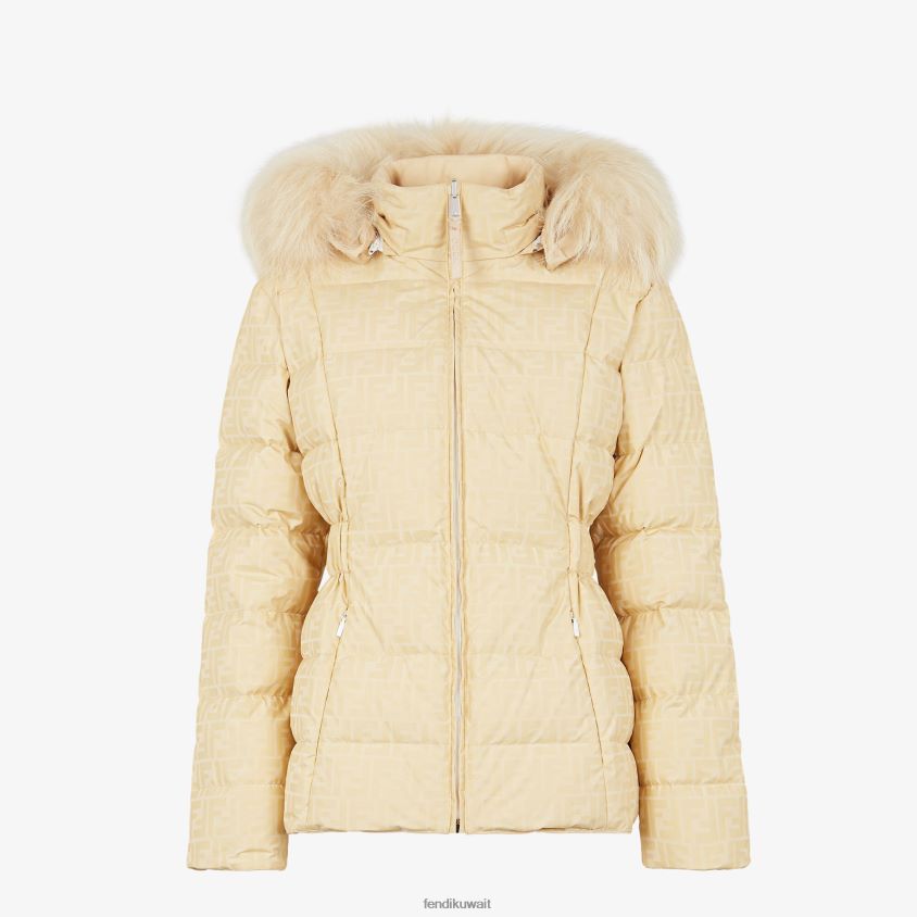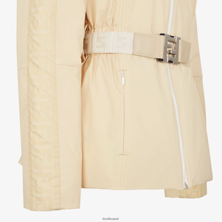 سترة تزلج ذات وجهين بياقة عالية وغطاء رأس قابل للإزالة مزين بفرو الثعلب. حشوة مطاطية على الخصر مع حزام مطابق. جيوب جانبية بسحاب وجيب لحامل بطاقات التزلج على الكم الأيسر. اغلاق سحاب البنطلون. مصنوع من النايلون الكريمي المجدد مع حشوة. أحد الجانبين بلون ثابت مع شريط ff مطبوع بلون مطابق على الأكمام، والآخر مخصص بزخارف مطبوعة بالكامل. حزام شريطي مطاطي مزين بزخارف جاكار ff وإبزيم ff معدني مطلي بالبلاديوم. حشوة من ريش البط المُعاد تصنيعها.