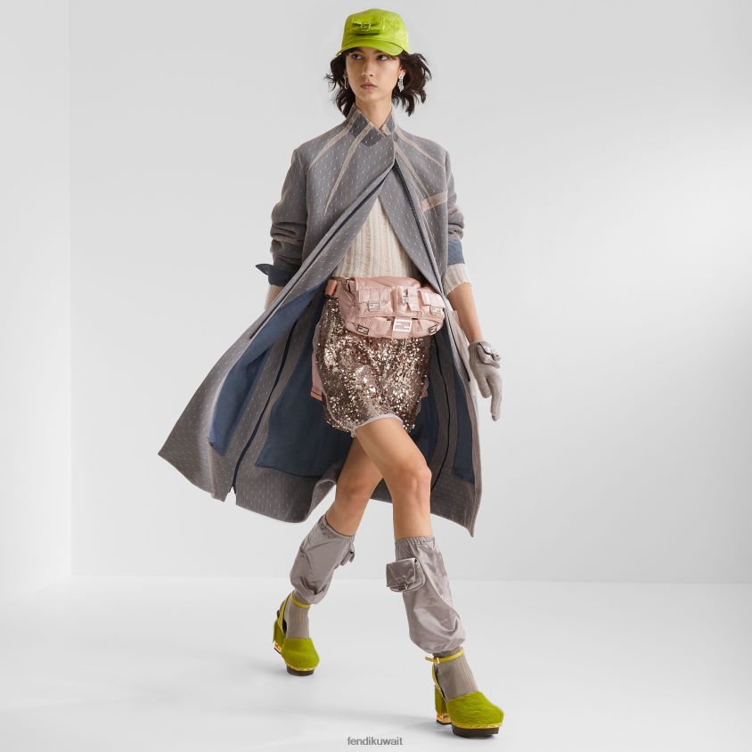 تنورة قصيرة مع خصر عالي مطاطي. مصنوع من الشيفون الحريري الليلكي، ومغطى بالكامل بتطريز الترتر بالكامل. إن الصنعة المستوحاة من إعادة إصدار مجموعة ربيع/صيف 2000 ذات اللون الأصفر الباجيت، تخلق تأثيرًا ثلاثي الأبعاد متطورًا مع ترتر دائري بحجمين مختلفين. مزين بكشكشة بلون واحد على الجوانب والخصر والحاشية.