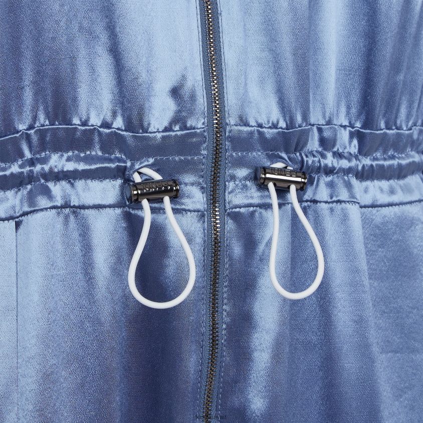 بذلة مصنوعة من الساتان الفيسكوز باللون الأزرق الفاتح. مزين بأشرطة طويلة وجيوب كارجو ماكسي في الأمام.