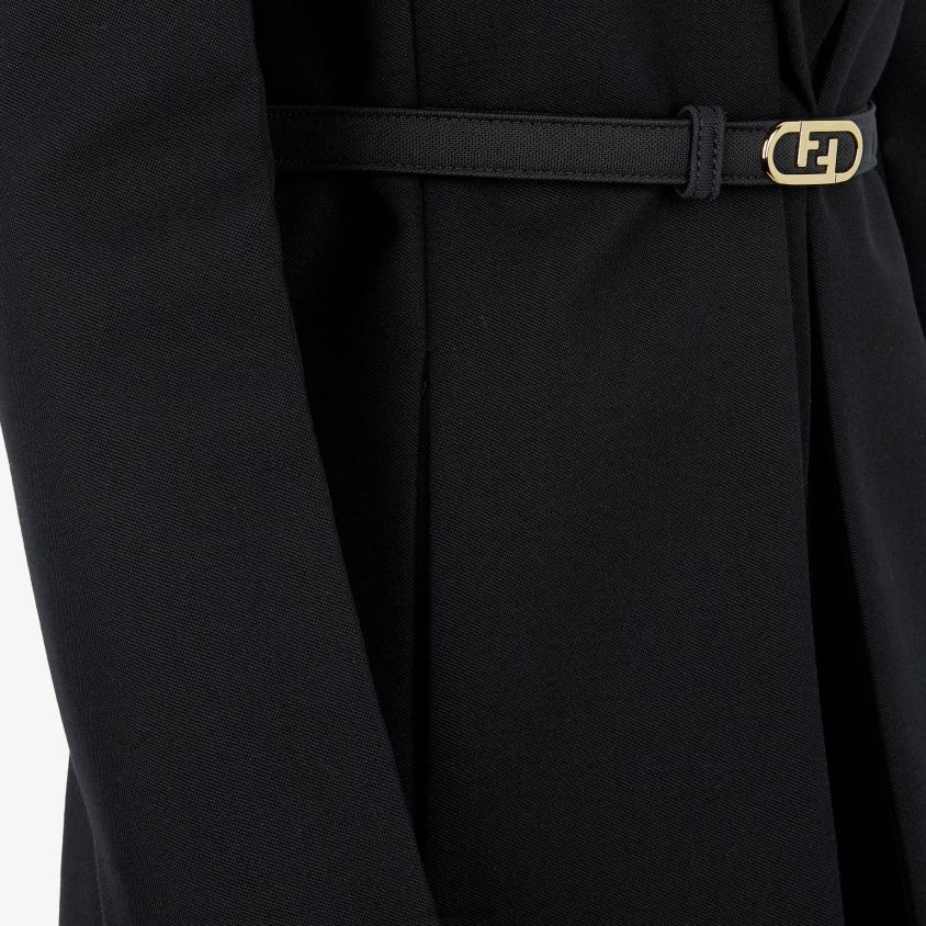سترة قصيرة متعددة الطبقات. يتكون هذا النمط من سترة بدون طية صدر السترة وسترة بدون ظهر قابلة للإزالة مع طية صدر السترة. يمكن ارتداؤها معًا أو بشكل منفصل. حزام مطابق بإبزيم معدني من فندي أولوك. مصنوعة من صوف الحبوب السوداء دي بودر. الجيليه له ياقة وطية صدر حريرية بنفس اللون.