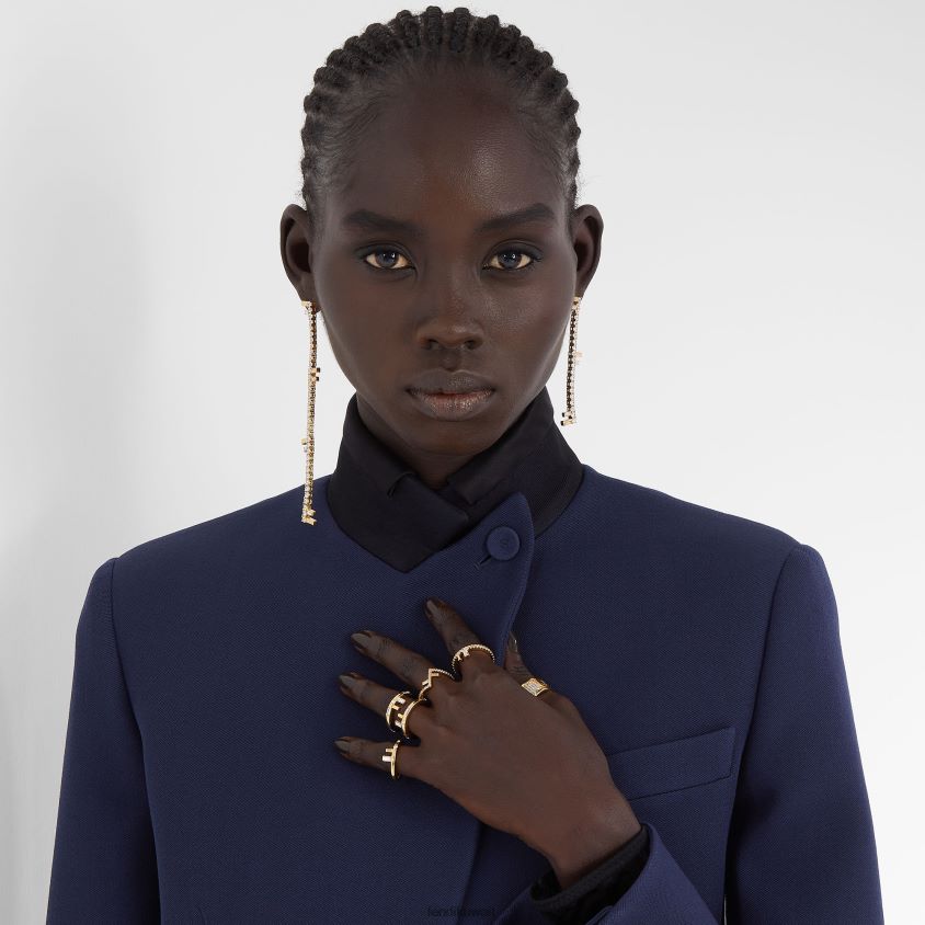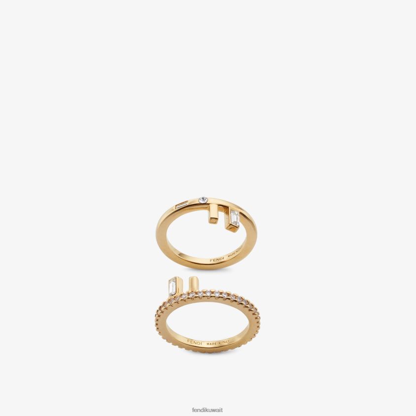طقم من حلقتين رفيعتين مع شعار فندي الأول. مصنوعة من المعدن مع لمسة نهائية ذهبية. مزين بكريستالات مستديرة بيضاء اللون مقطوعة على شكل باغيت.