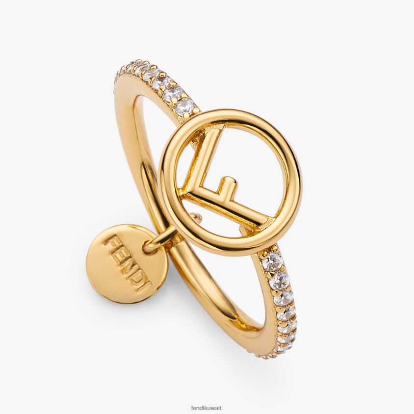 خاتم بشعار فندي الجديد. مصنوعة من المعدن المطلي بالذهب. السوار مزين بالزركون ذو الألوان الطبيعية.