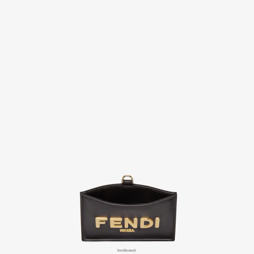 شارة اسم فندي روما بجيب مسطح وسلسلة معدنية. مصنوع من الجلد الأسود. أدوات معدنية مطلية بالذهب.