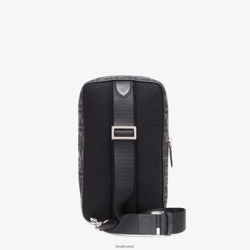 حقيبة ظهر ذات كتف واحد بتصميم عمودي، مصنوعة من قماش الجاكار المعاد تدويره مع شعار ff باللونين الرمادي والأسود. مجهزة بجيب خارجي بسحاب وشبكة خلفية تقنية. تفاصيل من الجلد الأسود.