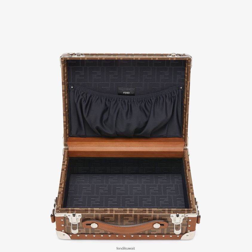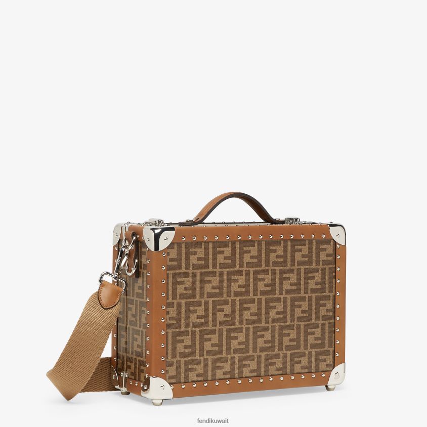 نسخة صغيرة من صندوق السفر المستطيل مع قفل مزدوج وقفل سريع. مقبض واحد مع علامة حلقة مفاتيح وحزام كتف قابل للتعديل والفصل. حجرة داخلية كبيرة مع جيب للصحيفة. الهيكل الخشبي مغطى بقماش بني مصقول بزخارف جاكار ff. تم تشطيبه بحواف جلدية وتفاصيل معدنية ومسامير. واصطف داخل ليكرا وما يليها. حزام كتف من القماش. أدوات معدنية مطلية بالبلاديوم.