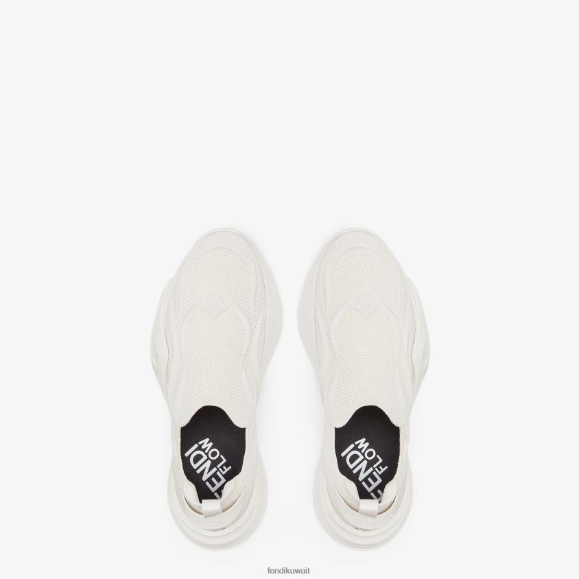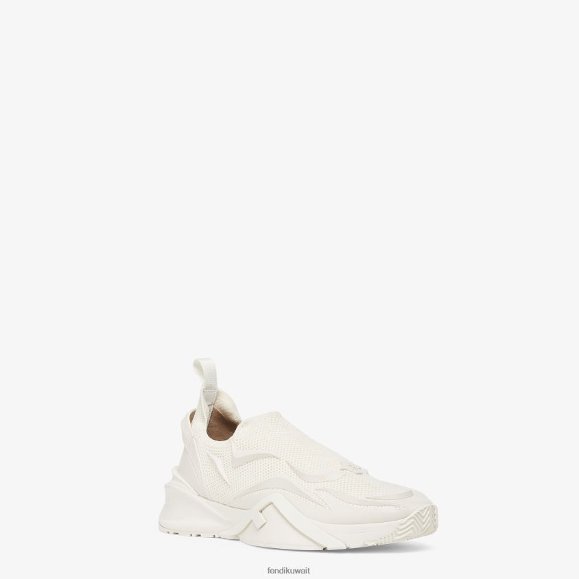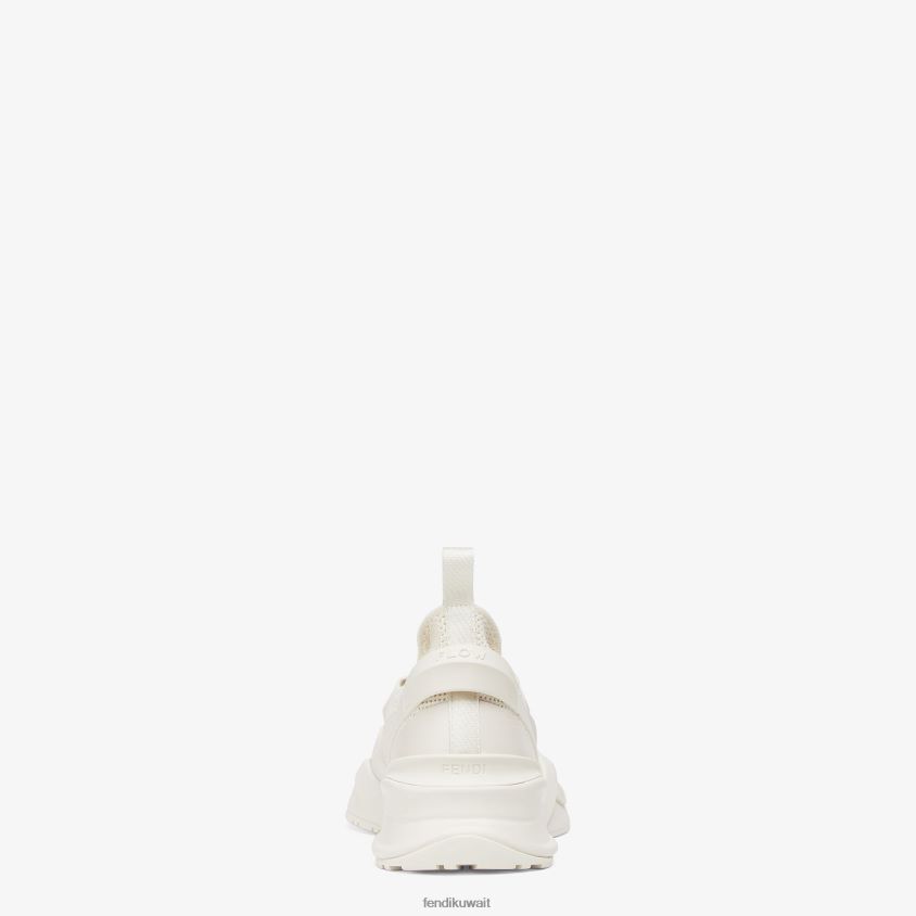 حذاء رياضي سهل الارتداء بنعل مموج مع نقش f. حروف فندي المتدفقة منقوشة على الكعب. مصنوعة من شبكة الجاكار باللون الأبيض. تفاصيل بلون على مطاط بلون مزخرف بتقنيات حرفية مبتكرة.
