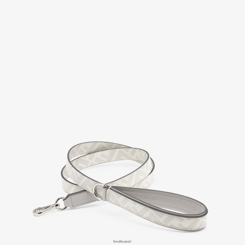 مقود كلب مع حلقة ومشبك مخصص بحروف فندي. مصنوع من القماش بزخارف ff باللونين الأبيض والرمادي الفاتح. تفاصيل جلدية بيضاء. أدوات معدنية مطلية بالبلاديوم.