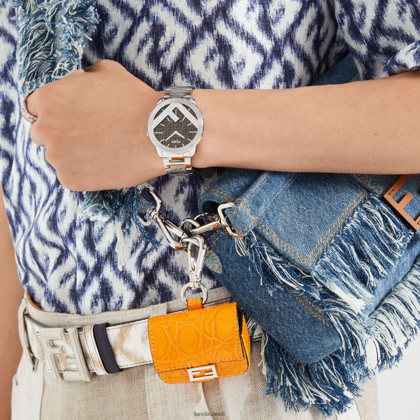 علبة دائرية لامعة مقاس 41 مم من الفولاذ المقاوم للصدأ باللون الفضي مع حشوة من الفولاذ المقاوم للصدأ بلون واحد. ميناء بني بعيد عن المركز بأشعة الشمس مع طبعة ff سوداء شفافة ومؤشرات وعقارب فضية. سوار من الفولاذ المقاوم للصدأ بلون واحد، مقاس 20/18 ملم، مع شعار ff منقوش ومشبك قابل للطي.