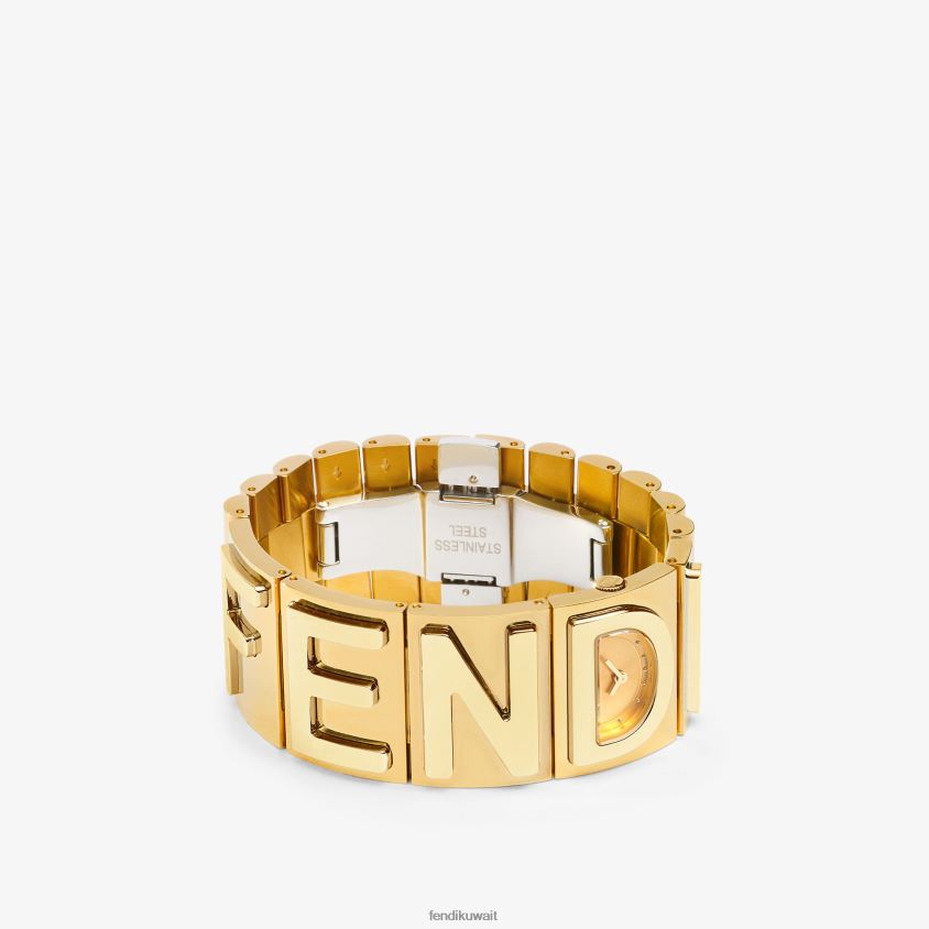 علبة من الفولاذ المقاوم للصدأ على شكل حرف d مع طلاء PVD ذهبي اللون. تاج مع شعار ff محفور. قرص بلون الشمبانيا مع مؤشرات ذهبية اللون وعقارب نصف قطرها. سوار شبكي مستطيل الشكل من الفولاذ المقاوم للصدأ، مقاس 25 مم، مع طلاء PVD ذهبي اللون وحروف شعار فندي أحادية اللون. مشبك قابل للطي.