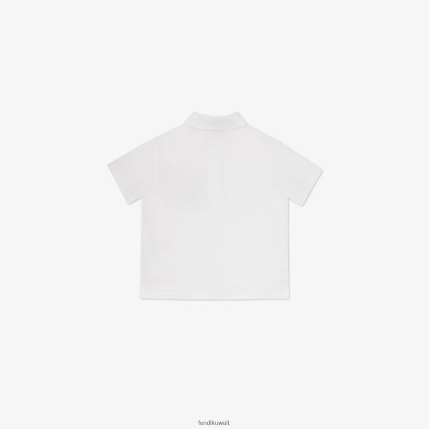 تيشيرت بولو للصغار مصنوع من الجيرسيه الأبيض مع جيب على الصدر من النايلون باللون الأزرق الداكن وتطريز فندي باللون الأبيض.
