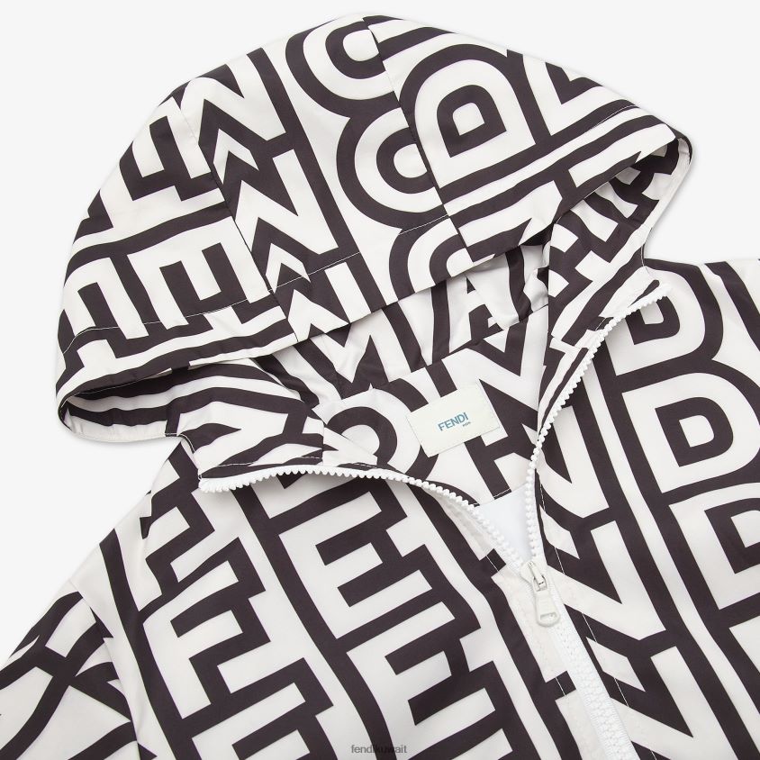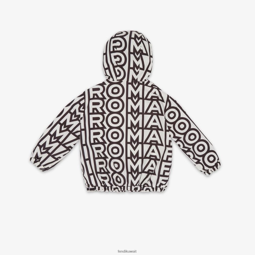سترة واقية من الرياح بتصميم ميني مي من جونيور مع غطاء رأس وسحاب. جزء من إصدار فندي باي مارك جاكوبس المحدود، هذا الطراز يحمل شعار فندي روما كبير باللونين الأسود والأبيض.