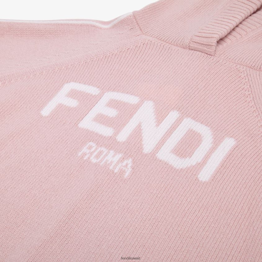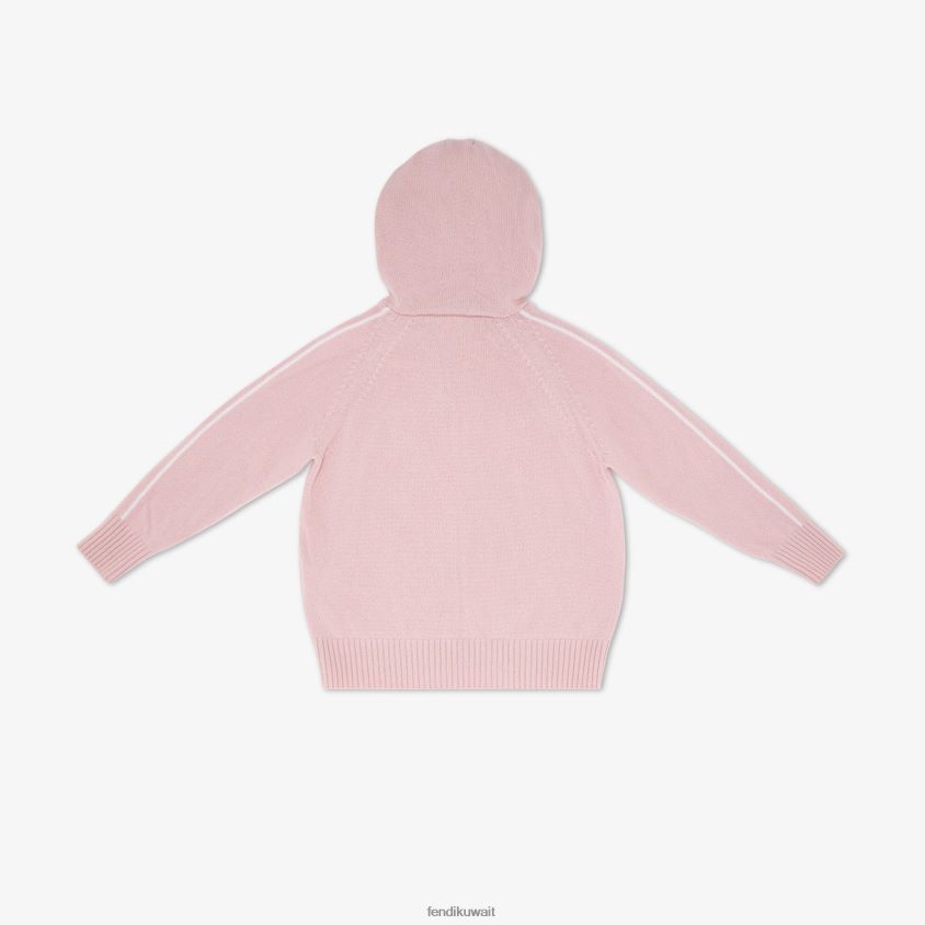 سترة جونيور من الكشمير الخالص باللون الوردي مع غطاء رأس وكتابة فندي روما إنتارسيا باللون الأبيض من الأمام.