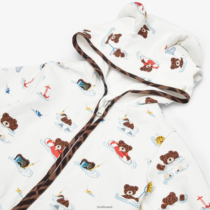 سويت شيرت أطفال من القطن بغطاء للرأس وأذنين. طبعة دمية دب متعددة الألوان على كامل التصميم وزخرفة من القماش بلون التبغ.