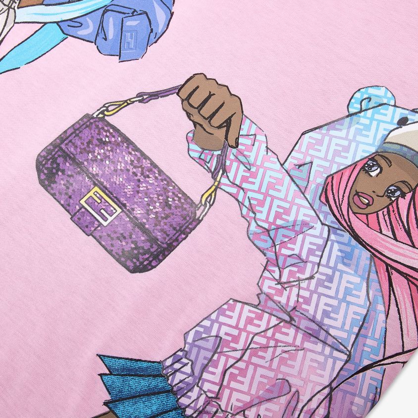 تيشيرت للصغار مصنوع من الجيرسيه الوردي مع طبعة مانغا متعددة الألوان على كامل التصميم من الأمام.