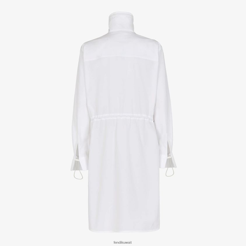 فستان قميص بياقة عالية، مع إغلاق نصف سحاب مغطى في الأمام. يتميز بتفاصيل الرباط على الياقة، والأصفاد وعلى الخصر. خط مستقيم مع جيوب جانبية كبيرة الحجم، وفتحات جانبية، وحاشية غير متماثلة أطول على الظهر. مصنوعة من قطن البوبلين الأبيض. جيبان على الصدر مع غطاء وزخرفة باغيت ff منقوشة.
