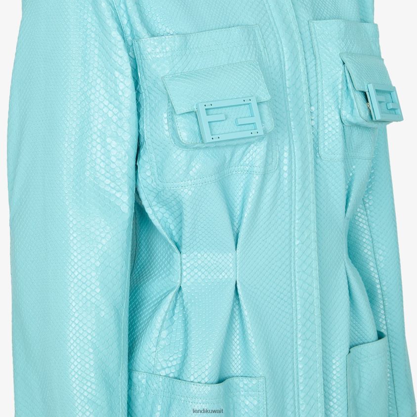 فستان على شكل قميص بياقة دائرية، وسهام على الخصر، وأكمام طويلة منتهية بسوار على شكل قميص. جيوب بقلاب بإبزيم باغيت ff على الصدر. مصنوع من جلد الثعبان باللون الفيروزي.