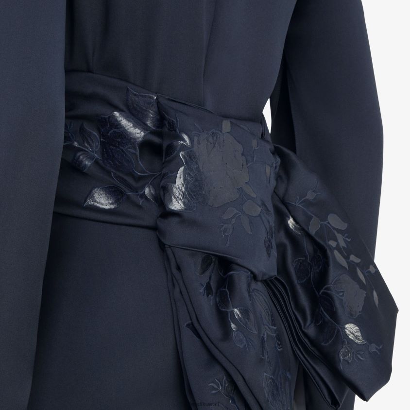 فستان طويل ضيق عند الخصر، مع رقبة دائرية وأكمام طويلة. مصنوعة من الساتان المتدفق باللون الأزرق الداكن. حزام أوبي بتصميم معقود على الخصر الخلفي.