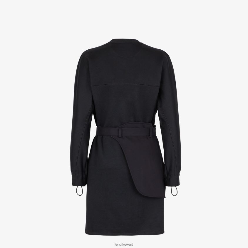 فستان قصير على شكل سويت شيرت بياقة دائرية وأكمام طويلة. يتميز الثوب بحزام قابل للإزالة مع بيبلوم جانبي وجيب بحاشية. إبزيم معدني من فندي أولوك مع لمسة نهائية ذهبية. مصنوع من الجيرسيه الأسود الناعم.