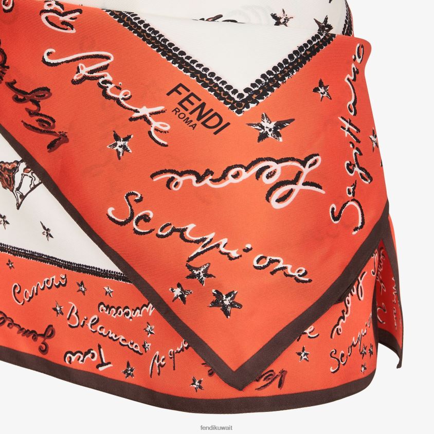فستان قصير بكتف واحد مع خط فولارد وزخرفة معقودة على الكتف والجانب. مصنوع من نسيج قطني طويل من الحرير باللونين البرتقالي والأبيض، ومخصص بالكامل بزخارف مطبوعة بعلم التنجيم من فندي.