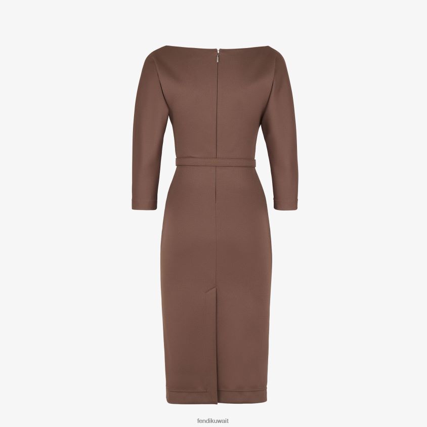 فستان ميدي ضيق بياقة V واسعة وأكمام بطول ثلاثة أرباع. فتحة في المنتصف في الخلف. حزام مطابق مع إبزيم فندي أولوك. مصنوع من قطن البيكيه البني.