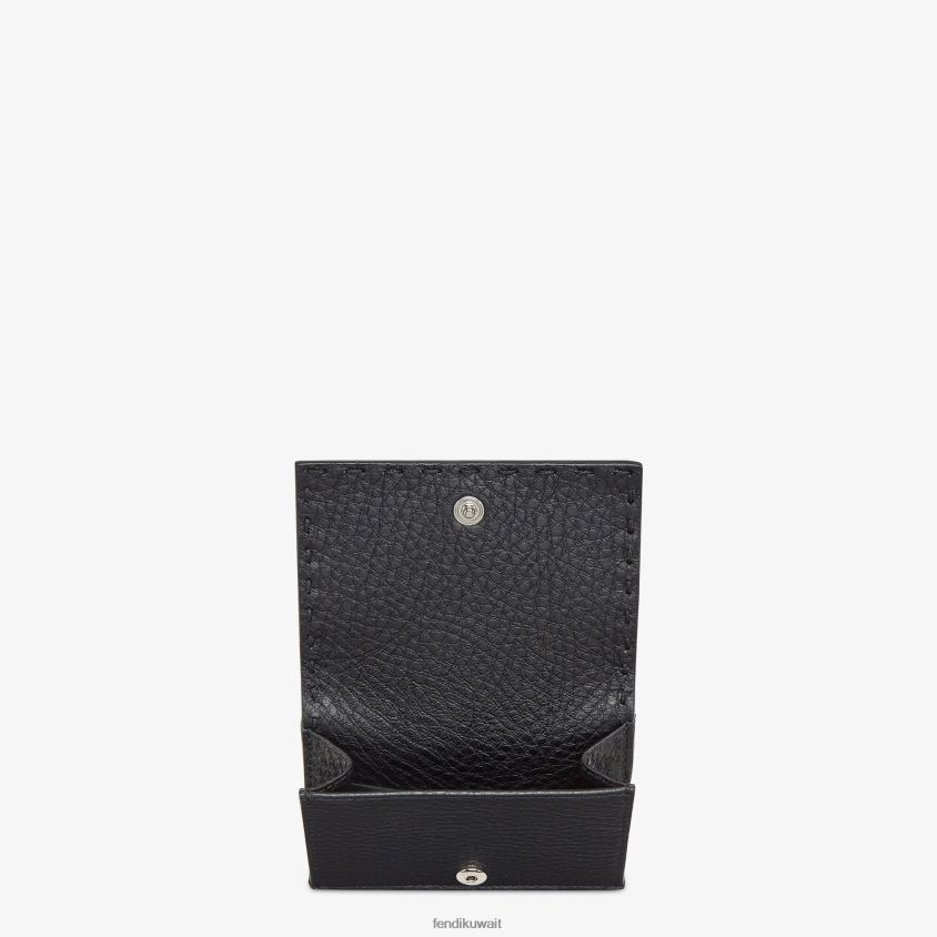 محفظة بقسمين داخليين للفواتير وجيب خارجي مزود بقفل سريع. مصنوع من جلد Cuoio Romano باللون الأسود. مزينة بحروف فندي روما وحواف منتهية بخياطة سيليريا المخيطة يدويًا. أدوات معدنية مطلية بالبلاديوم.