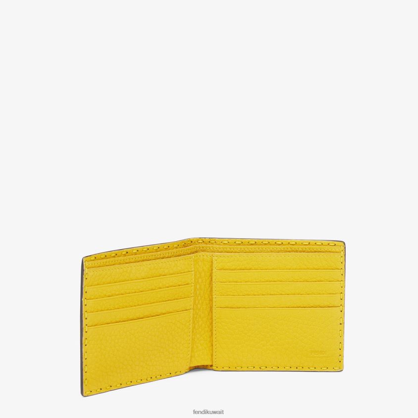 محفظة ثنائية الطي مع بطانة، منظمة في ثماني فتحات للبطاقات وحجرتين للفواتير. مخصصة بشعار فندي وغرز معدنية. مصنوع من جلد التمساح المصقول باللون الأصفر. بطانة من الجلد الروماني. زخرفة بغرزة معدنية مع لمسة نهائية من البلاديوم.