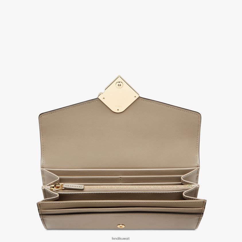 محفظة ff Diamonds Continental تُغلق بكبسة. واسعة ومنظمة بشكل جيد، مع جيبين مقواين، وجيب بسحاب، وعشرة فتحات للبطاقات، وجيوب جانبية مسطحة. مصنوع من الجلد الرمادي مع غطاء رمادي حمامة. أدوات معدنية مطلية بالذهب.