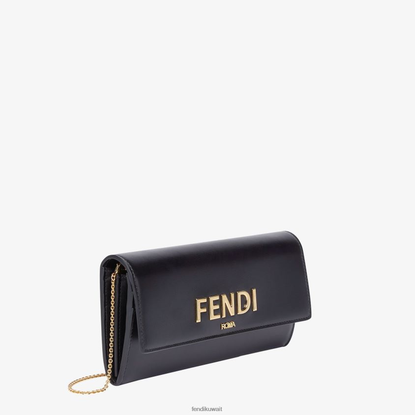 محفظة فندي روما كونتيننتال بسلسلة معدنية قصيرة. يتميز الجزء الداخلي بحجرتين مقواتين، وجيب بسحاب، وجيبين مسطحين وعشرة فتحات للبطاقات. مصنوع من الجلد الأسود. أدوات معدنية مطلية بالذهب.