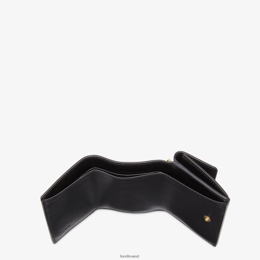 محفظة فندي روما ذات تصميم مدمج ثلاثية الطي مع سلسلة معدنية. يتميز الجزء الداخلي بعشرة فتحات للبطاقات، وجيبين مسطحين وحجرتين للفواتير. مصنوع من الجلد الأسود. أدوات معدنية مطلية بالذهب.