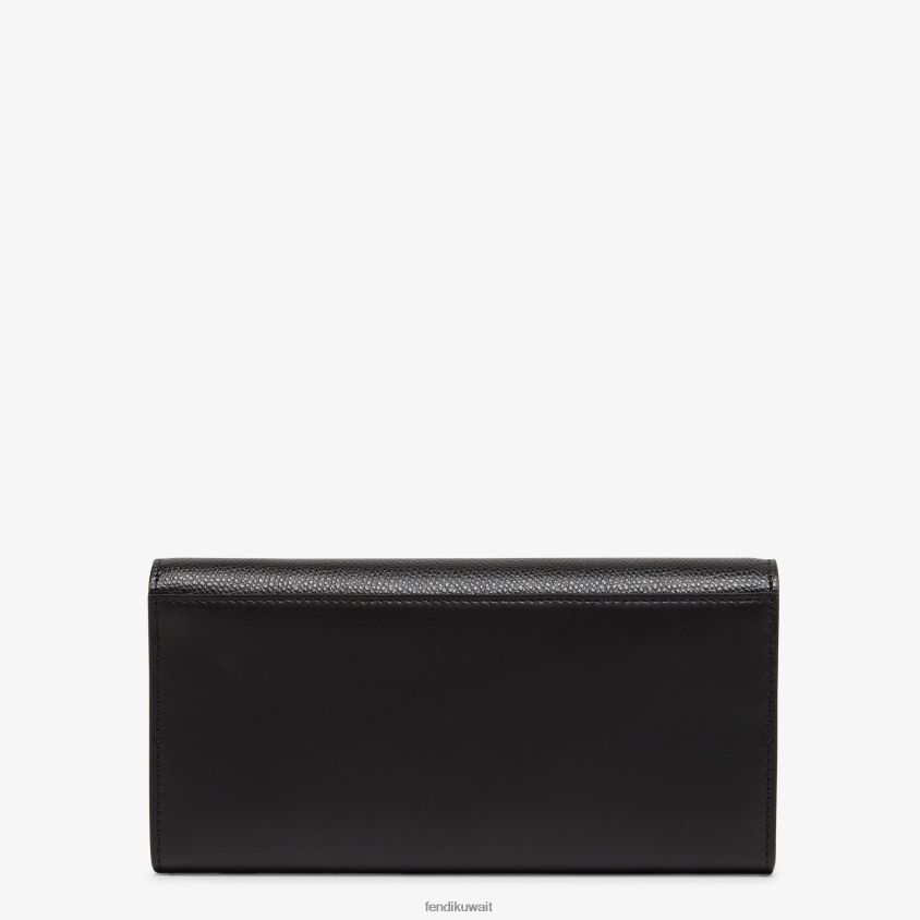 محفظة ff Diamonds كونتيننتال مع غطاء هندسي الشكل وشعار ff قطري وحزام سلسلة قابل للإزالة. تم تصميم الجزء الداخلي على شكل محفظة تحتوي على جزأين مقويين وجيب بسحاب وجيبين مسطحين وعشرة فتحات للبطاقات. مصنوع من الجلد الأسود. أدوات معدنية مطلية بالذهب.