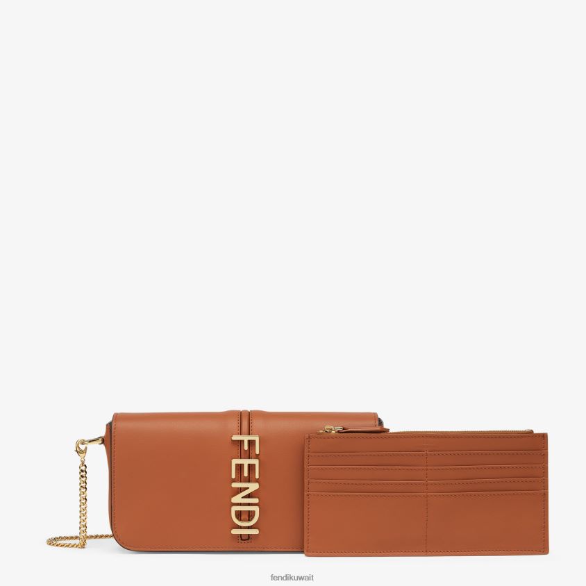 محفظة فنديغرافي مدمجة مع غطاء وحروف فندي معدنية. تتميز بحقيبة داخلية قابلة للإزالة مع ثمانية فتحات للبطاقات وجيب بسحاب. حزام كتف رفيع وسلسلة قابل للفصل. مصنوع من الجلد البني. أدوات معدنية مطلية بالذهب.