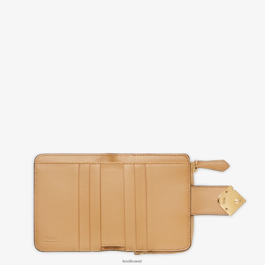 محفظة ff Diamonds مقسمة إلى ستة فتحات للبطاقات، وجيب للعملات المعدنية، وجيب للعملات المعدنية بسحاب، وجيب خلفي. مصنوع من الجلد البيج. أدوات معدنية مطلية بالذهب.