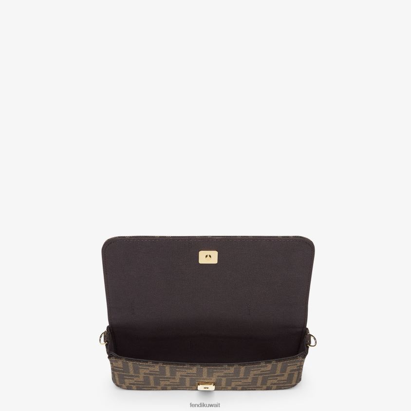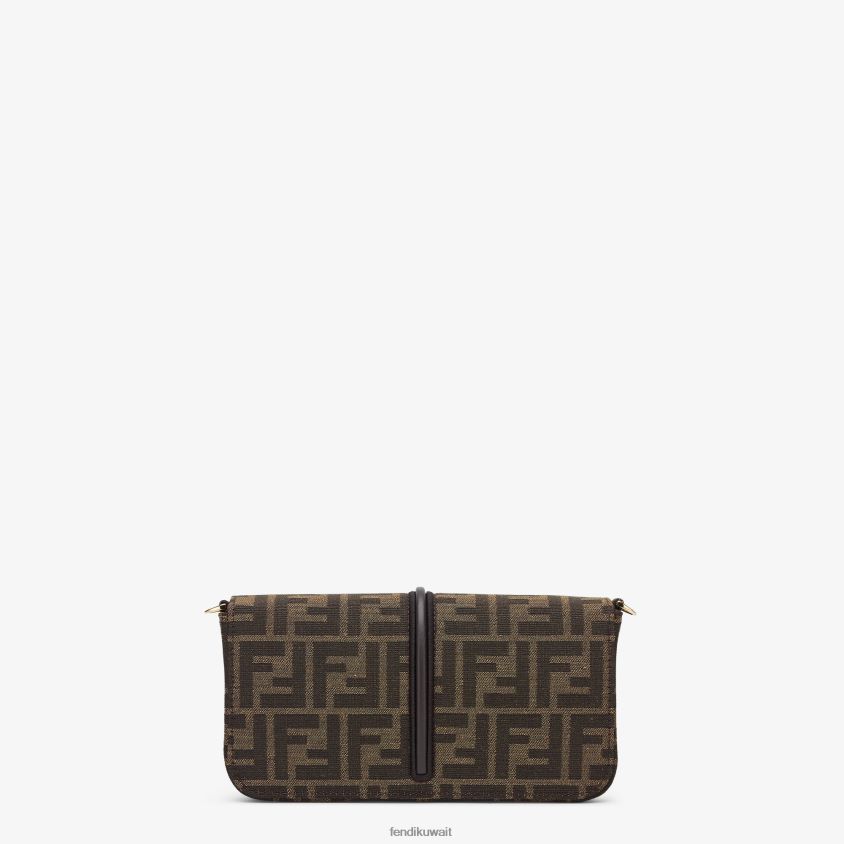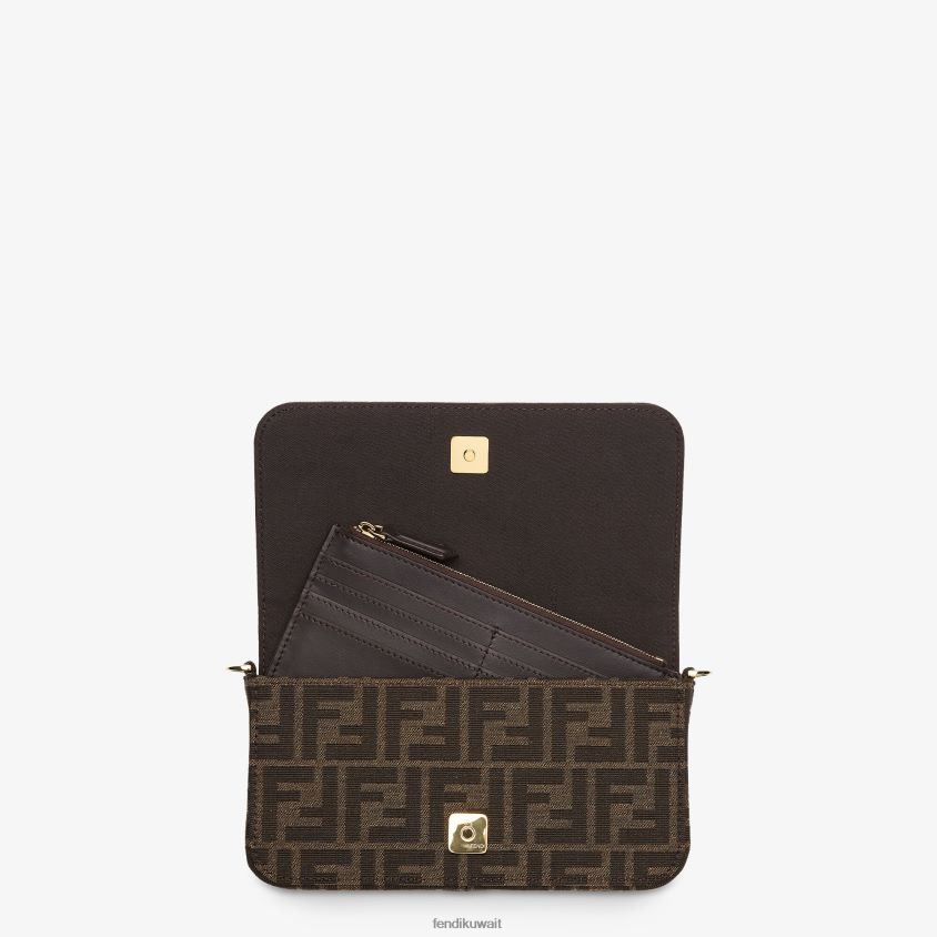 محفظة فنديغرافي مدمجة مع غطاء وحروف فندي معدنية. تتميز بحقيبة داخلية قابلة للإزالة مع ثمانية فتحات للبطاقات وجيب بسحاب. حزام كتف رفيع وسلسلة قابل للفصل. مصنوع من قماش الجاكار باللون البني. أدوات معدنية مطلية بالذهب.