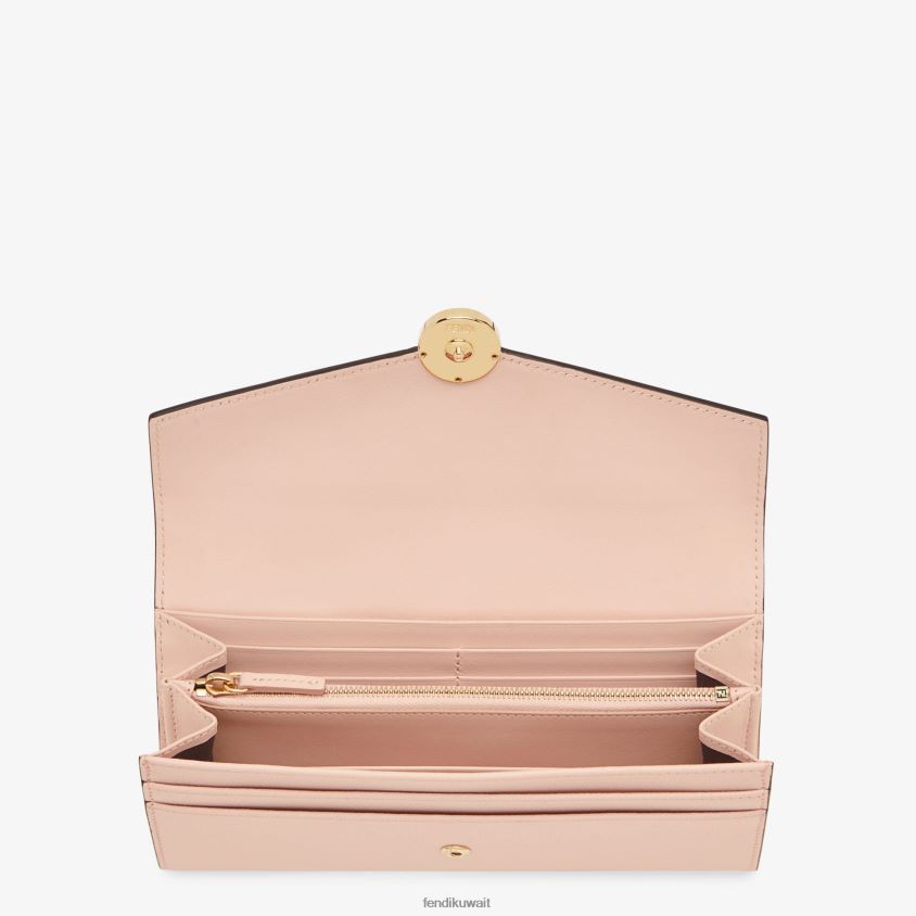 كونتيننتال إف هي محفظة فندي مثبتة بمسمار كبس. واسعة ومنظمة جيدًا، مع جيبين مقواين، وجيب بسحاب، وعشرة فتحات للبطاقات، وجيوب جانبية مسطحة. مصنوع من جلد كروز باللون الوردي الفاتح. أدوات معدنية مطلية بالذهب.