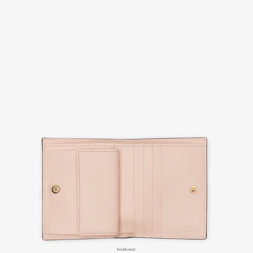 f هي محفظة فندي مدمجة ثنائية الطي. الجزء الداخلي منظم بجيب مسطح، وجيب للعملات المعدنية مع زر كبس وأربع فتحات للبطاقات. مصنوع من جلد كروز باللون الوردي الفاتح. أدوات معدنية مطلية بالذهب.