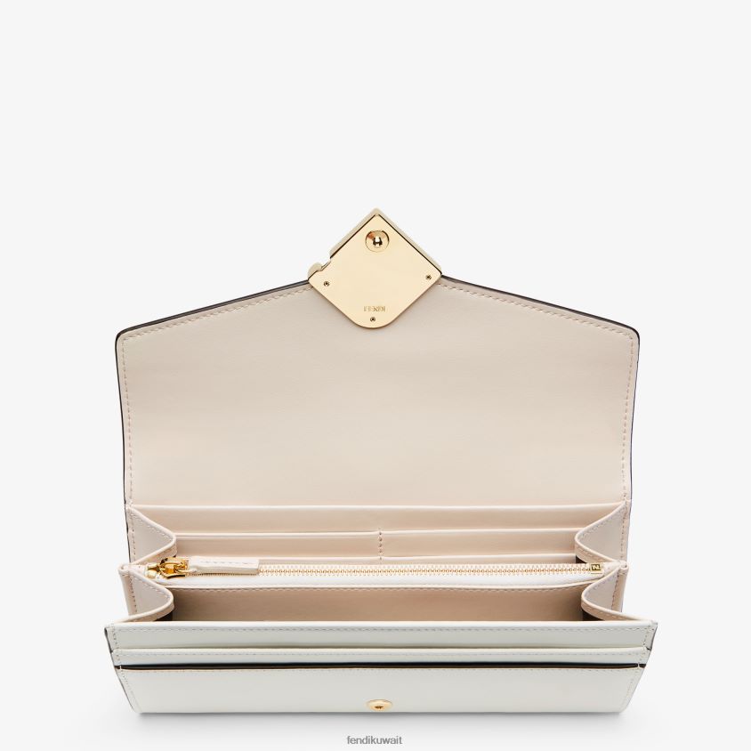 محفظة ff Diamonds Continental تُغلق بكبسة. واسعة ومنظمة بشكل جيد، مع جيبين مقواين، وجيب بسحاب، وعشرة فتحات للبطاقات، وجيوب جانبية مسطحة. مصنوع من الجلد الأبيض مع غطاء كاميليا. أدوات معدنية مطلية بالذهب.