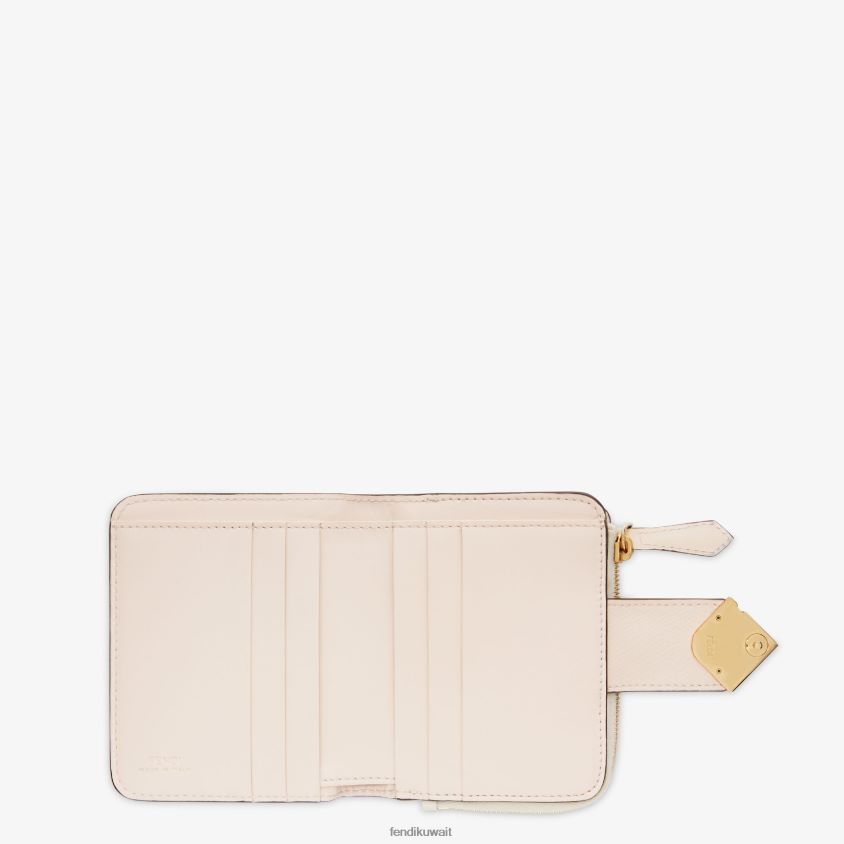 محفظة ff Diamonds مقسمة إلى ستة فتحات للبطاقات، وجيب للعملات المعدنية، وجيب للعملات المعدنية بسحاب، وجيب خلفي. مصنوع من الجلد الأبيض. كاميليا الداخلية والتفاصيل. أدوات معدنية مطلية بالذهب.