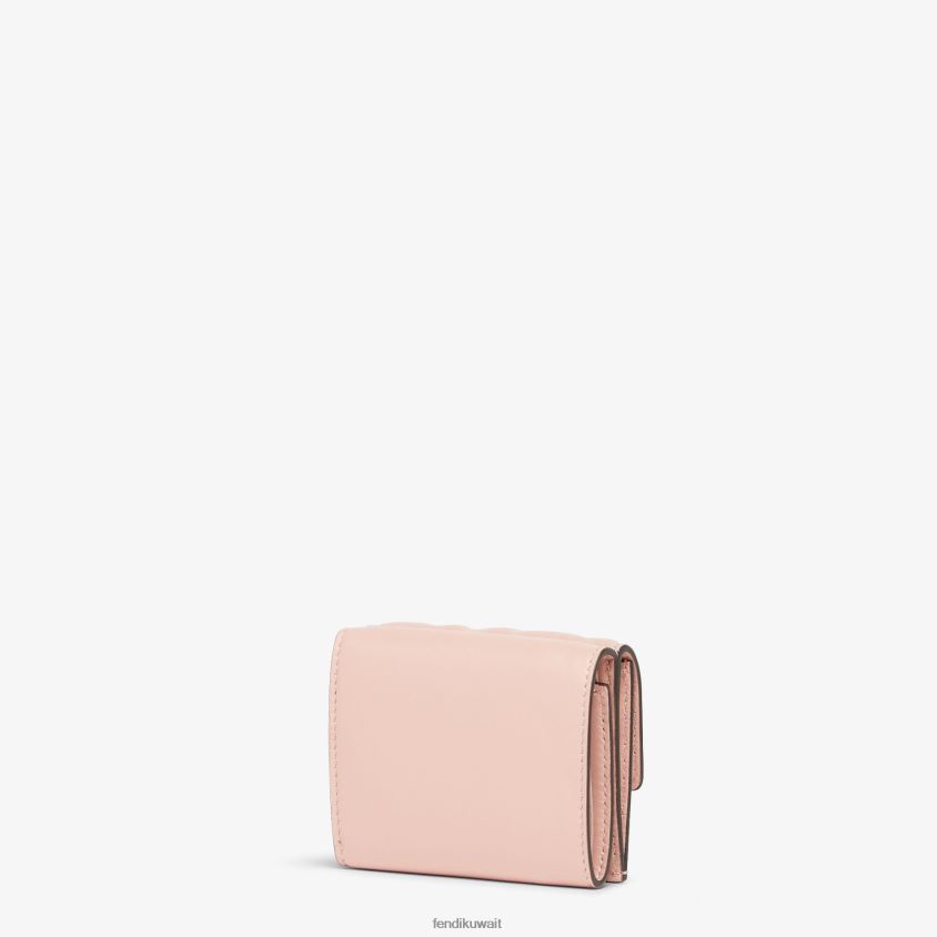 محفظة صغيرة الحجم من الرغيف الفرنسي ثلاثية الطي مع حجرة داخلية كبيرة للفواتير وثلاثة حاملات بطاقات مخفية ومحفظة خارجية للعملات المعدنية مع إغلاق سريع. مصنوع من جلد نابا باللون الوردي مع تصميم ff ثلاثي الأبعاد. أدوات معدنية مطلية بالذهب.