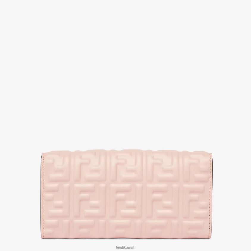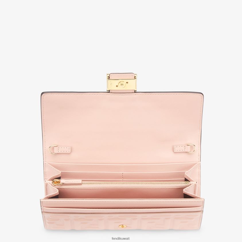 محفظة باجيت كونتيننتال مع حزام كتف رفيع من سلسلة قابل للفصل. تم تصميم الجزء الداخلي على شكل محفظة تحتوي على جزأين مقويين وجيب بسحاب وجيبين مسطحين وعشرة فتحات للبطاقات. مصنوع من جلد نابا باللون الوردي مع تصميم ff منقوش ثلاثي الأبعاد. أدوات معدنية مطلية بالذهب.