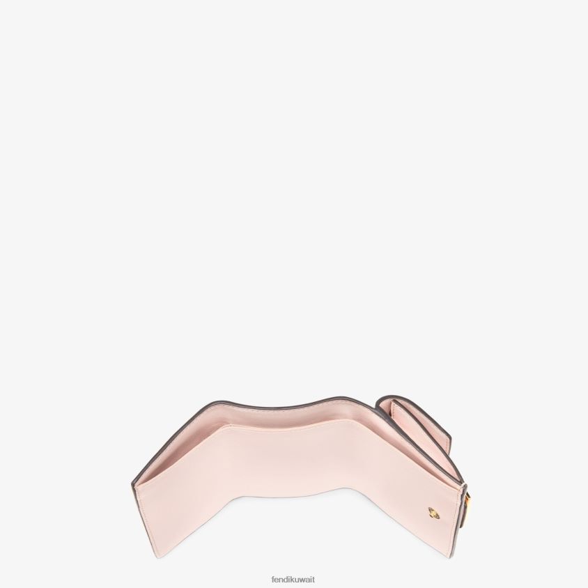 محفظة صغيرة الحجم من الرغيف الفرنسي ثلاثية الطي مع حجرة داخلية كبيرة للفواتير وثلاثة حاملات بطاقات مخفية ومحفظة خارجية للعملات المعدنية مع إغلاق سريع. مصنوع من جلد نابا باللون الوردي مع زخرفة FF منقوشة. أدوات معدنية مطلية بالذهب.