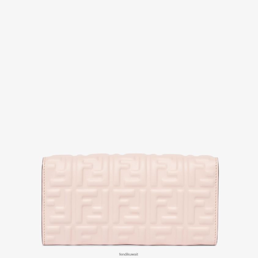 محفظة باجيت كونتيننتال مع حزام كتف رفيع من سلسلة قابل للفصل. تم تصميم الجزء الداخلي على شكل محفظة تحتوي على جزأين مقويين وجيب بسحاب وجيبين مسطحين وعشرة فتحات للبطاقات. مصنوع من جلد نابا باللون الوردي مع زخرفة FF منقوشة. أدوات معدنية مطلية بالذهب.