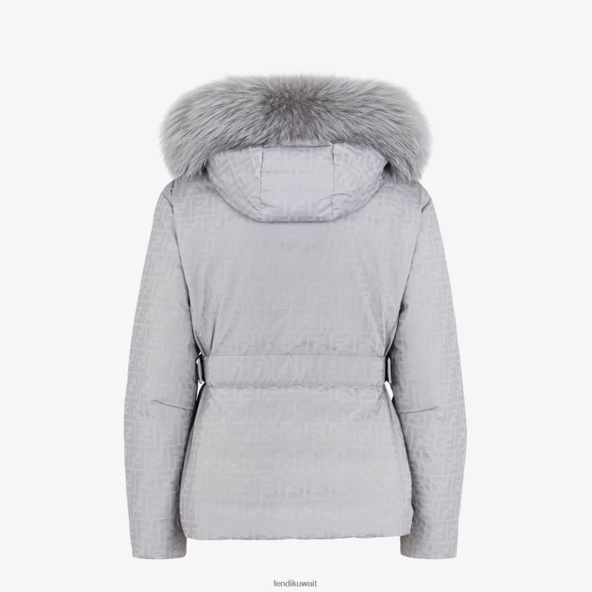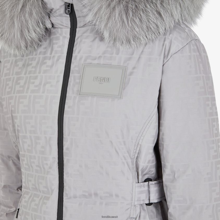 سترة تزلج بياقة عالية وغطاء رأس قابل للإزالة مزين بفرو الثعلب. حشوة مرنة على الخصر مع أشرطة جانبية قابلة للتعديل. جيوب جانبية بسحاب وجيب لحامل بطاقات التزلج على الكم الأيسر. اغلاق سحاب البنطلون. مصنوع من قماش رمادي اللون مع طباعة FF بالكامل بنفس اللون. مزين برقعة فندي مطاطية باللون الرمادي على الصدر.