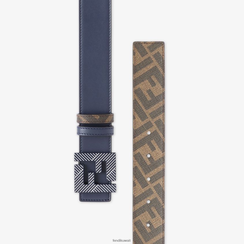 حزام ذو وجهين بإبزيم مسمار مربع ff. مصنوع من الجلد الأزرق. بطانة من القماش بزخارف ff. إكسسوارات معدنية مطلية بنمط ظلال فندي باللونين الأزرق والأبيض.