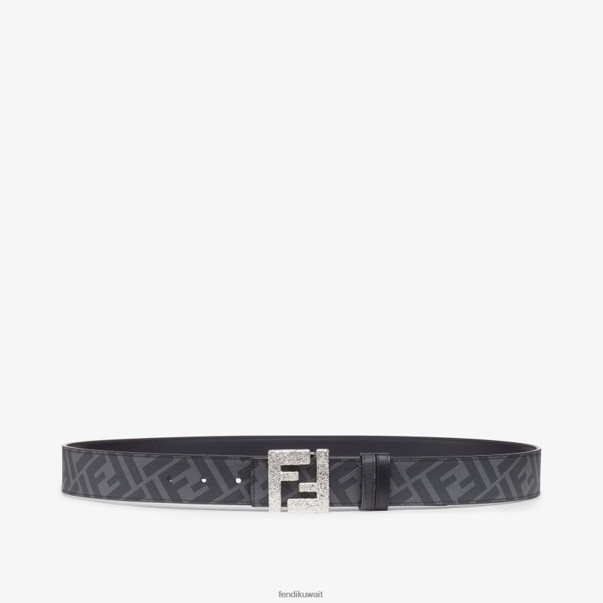 حزام ذو وجهين. إبزيم مسماري مبدع. مصنوع من الجلد الأسود الناعم. بطانة من القماش بزخارف ff باللونين الرمادي والأسود. أدوات معدنية مطلية بالبلاديوم وتأثير صخري مطروق.