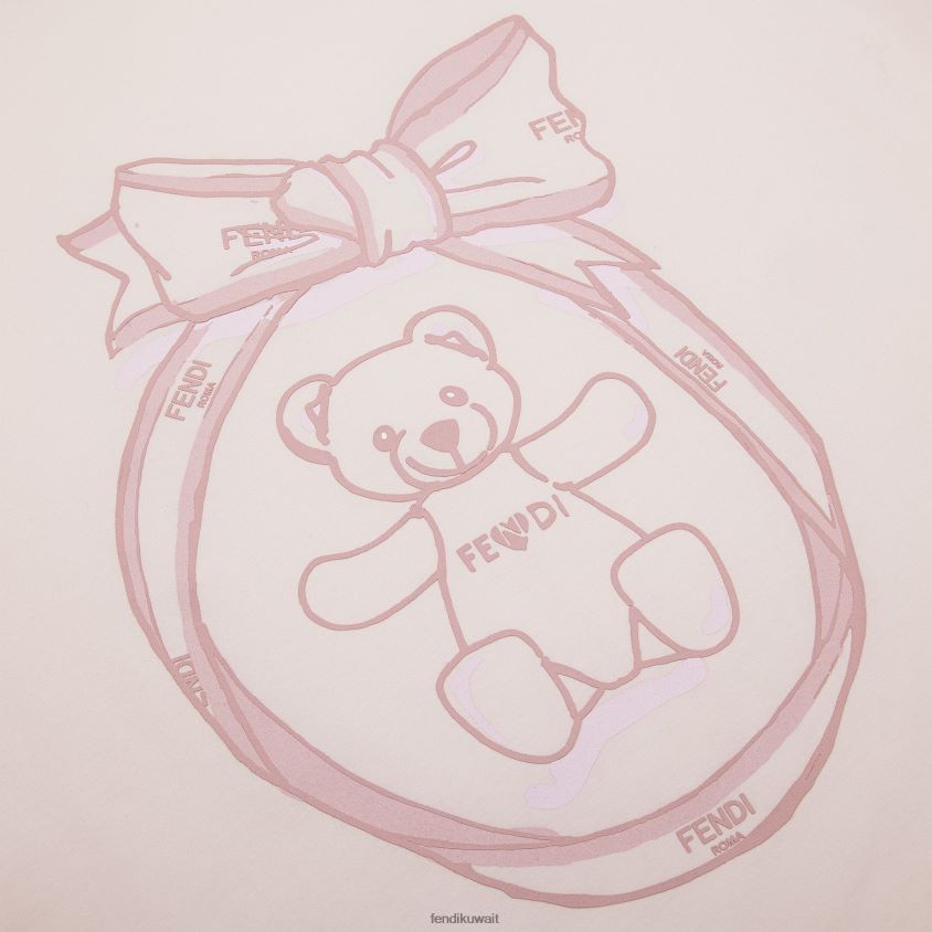 بطانية أطفال من الجيرسيه باللون الوردي مع حواف بيضاء وطبعة دب فندي بألوان متعددة.