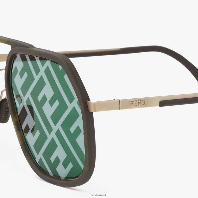 نظارات شمسية مربعة بتصميم خفيف للغاية، مع إطارات مصبوبة بالحقن من مادة الهافانا المطاطية. إطار أمامي بجسر مزدوج وعدسات خضراء فضية عاكسة مع شعار ff بالكامل. أذرع رفيعة ووسادات أنف قابلة للتعديل.